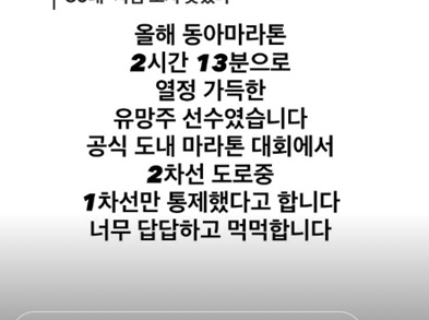 진태현은 10일 자신의 개인계정에 이날 열린 마라톤 대회 중 발생한 사고 기사를 공유했다. 진태현은 이와 함께 "올해 동아 마라톤 2시간 13분으로 열정 가득한 유망주 선수였습니다. 공식 도내 마라톤 대회에서 2차선 도로 중 1차선만 통제했다고 합니다. 너무 답답하고 먹먹합니다"라고 심경을 전했다.