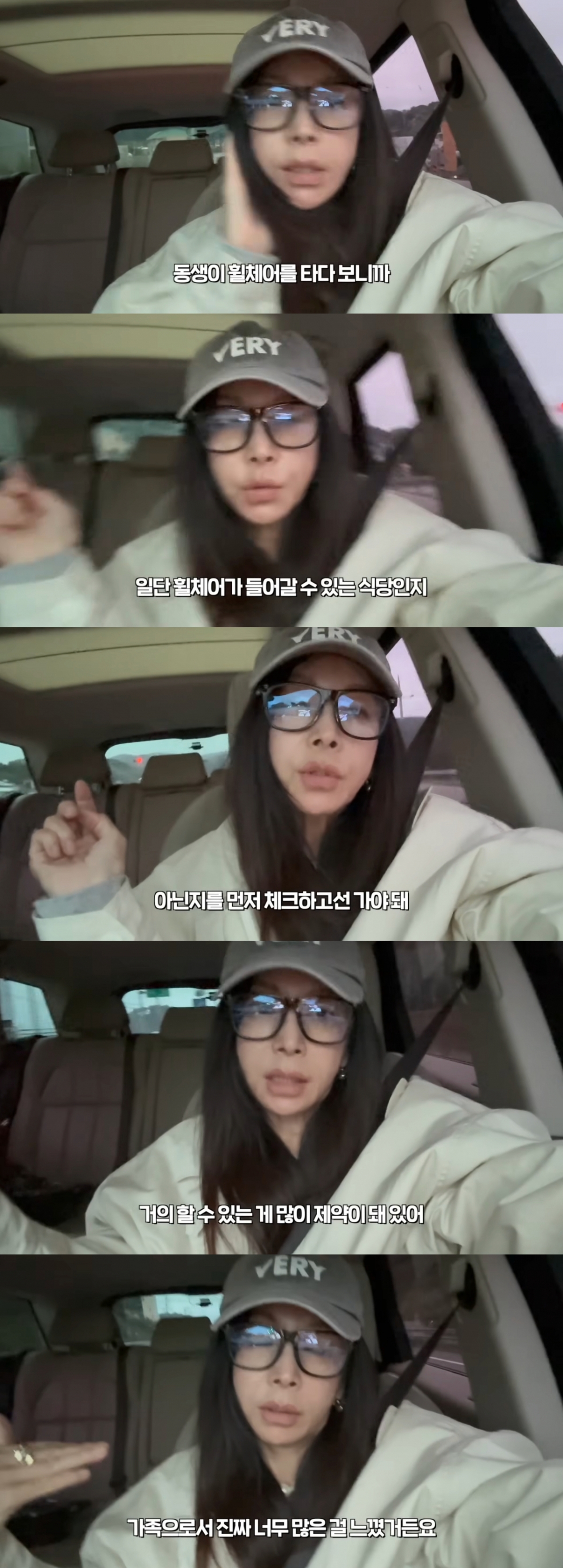 이날 황신혜는 "이번에 남동생 가족과 같이 여행을 왔다. 동생이 휠체어를 타다 보니까 저희가 먹고 싶은 데를 가는 게 중요한 게 아니라 휠체어가 들어갈 수 있는 식당인지 먼저 체크하고 가야 한다"고 말했다.