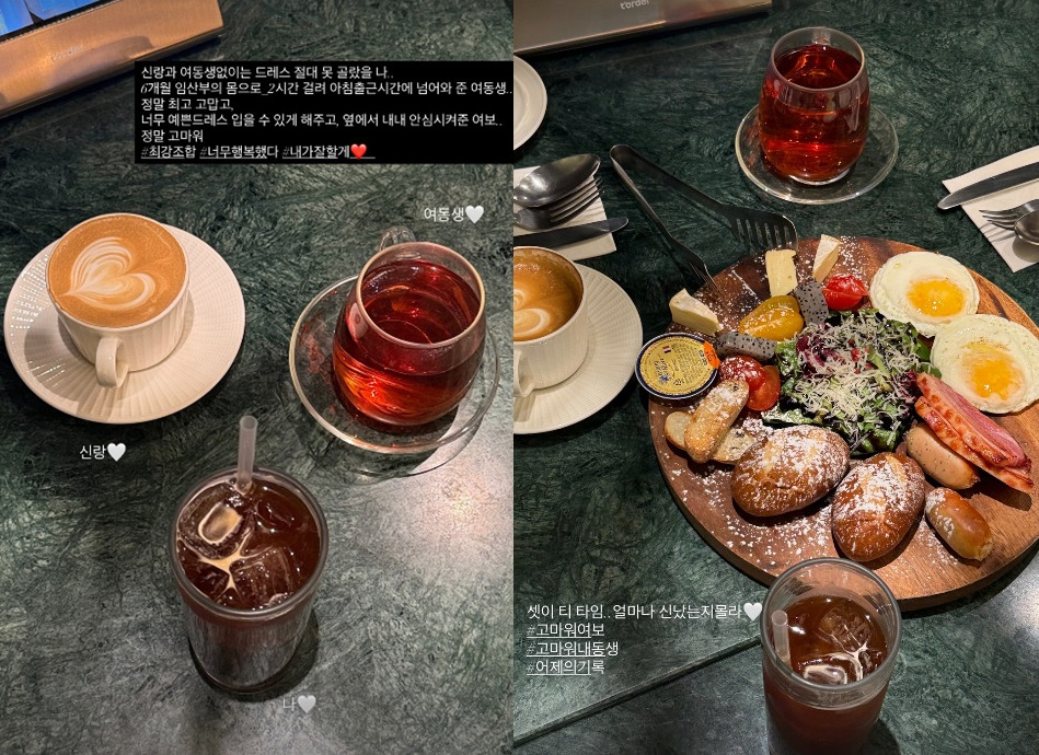 그는 "6개월 임산부 몸으로 2시간 걸려 아침 출근 시간에 넘어와 준 여동생 정말 최고 고맙고, 너무 예쁜 드레스 입을 수 있게 해주고 옆에서 내내 안심시켜준 여보 정말 고마워"라며 "셋이 티 타임 얼마나 신났는 몰라. 고마워 여보, 고마워 내 동생"이라고 전했다.