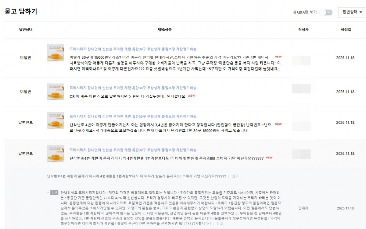 소비자들은 "이 제품은 난각번호 4번란인데 왜 동물복지란 가격에 판매 하시는 건지 알 수 있을까요?", "코디세핀이 몸에 어떻게 좋은 작용을 하는지 관련 논문이나 임상시험이 있을까요?", "마트에서도 동물 복지 유정란 난각번호 2번을 25구 한 판에 1만 원에 안 되게 파는데 난각번호 4번을 1만 5천 원에 이게 맞아요?", "닭이 먹는 사료가 무농약인 건가요?", "난각번호 4번 계란이 문제가 아니라 4번 계란을 1번 계란보다도 더 비싸게 받는게 문제죠! 소비자 기만 아닌가요?" 등 질문글을 올렸다.