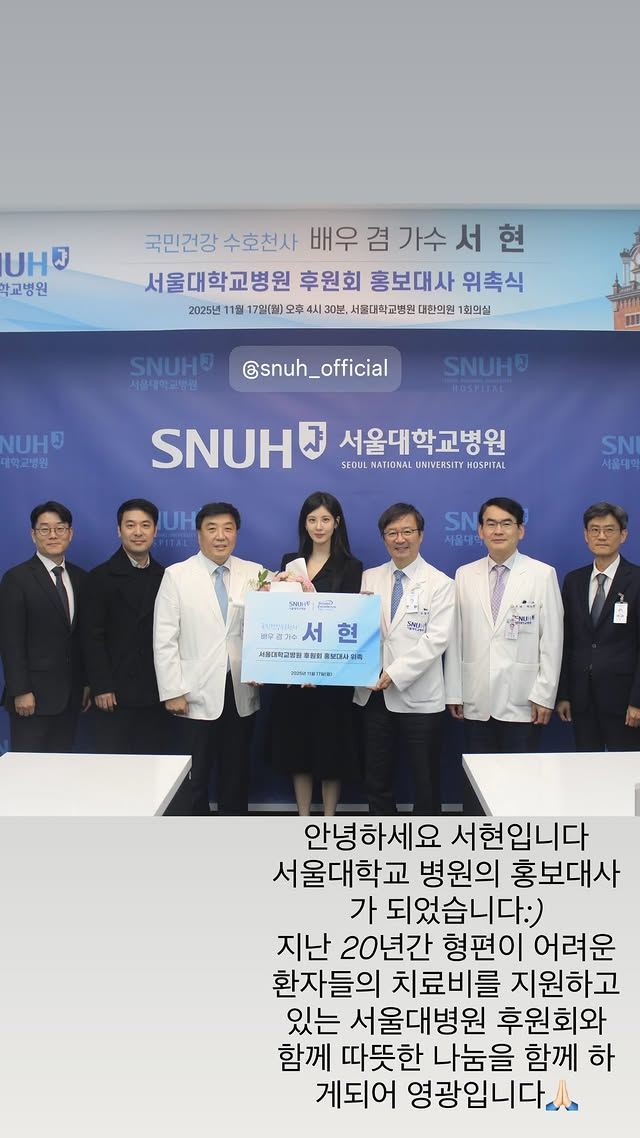 이어 서현은 "더 따뜻한 세상을 위한 서울대병원의 선한 행보를 언제나 응원하겠습니다"라고 말했다.