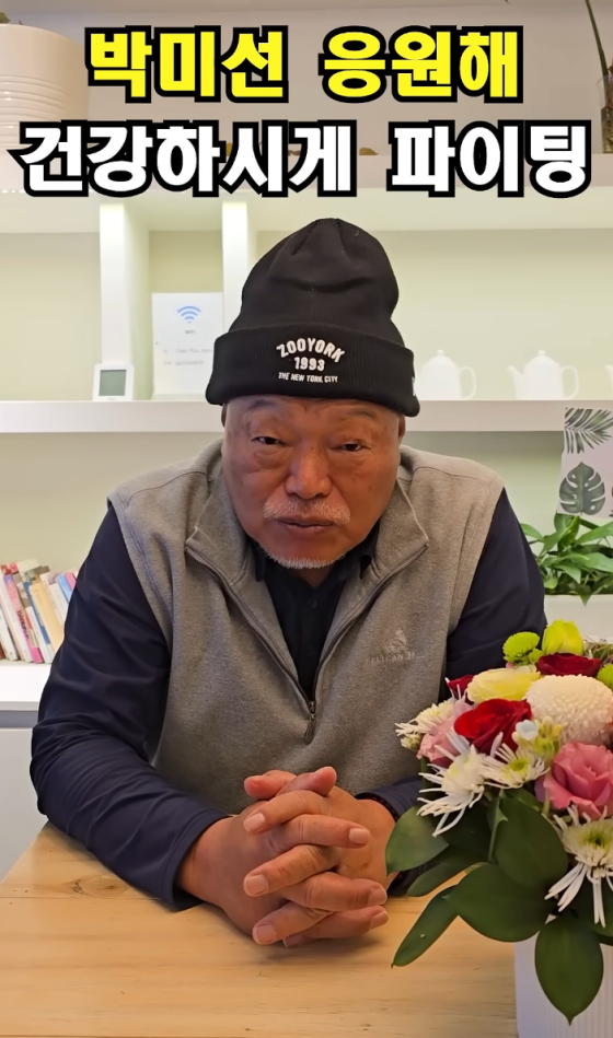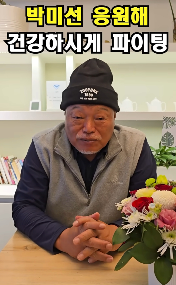 영상 속 김흥국은 비니 모자를 쓰고 카메라를 향해 박미선에게 영상 편지를 띄웠다. 부쩍 수척해진 모습이었다.