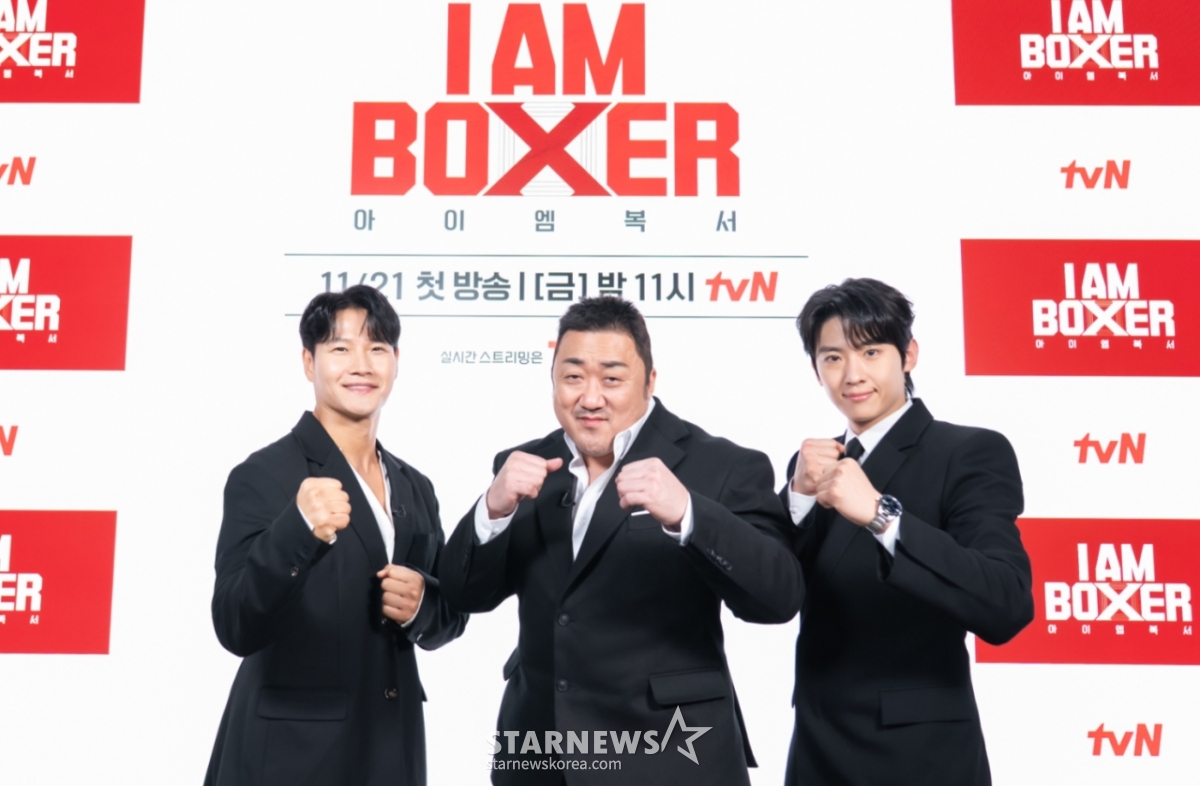 김종국, 마동석, 덱스가 19일 온라인으로 진행된 tvN 예능 'I AM BOXER'(아이 엠 복서) 제작발표회에 참석해 포즈를 취하고 있다.