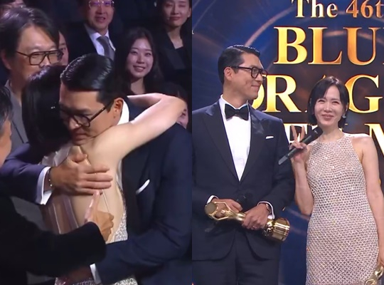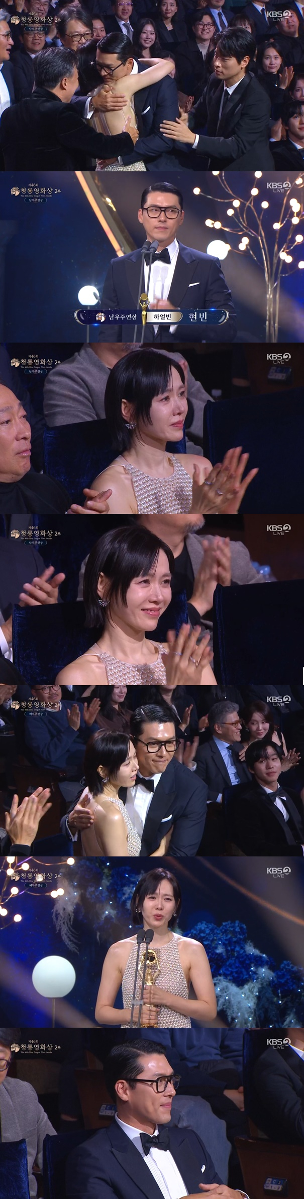 이어 여우주연상으로는 '어쩔수가없다'의 손예진이 호명됐다. 이날 손예진은 전혀 예상 못한듯이 놀라서 일어났고, 그런 손예진을 현빈이 안아줬다. 남편의 수상에는 뛸듯이 기뻐했지만, 정작 자신의 수상에는 놀라워하자 이번에는 남편 현빈이 아내를 꼭 끌어안고 힘이 돼 줬다.
