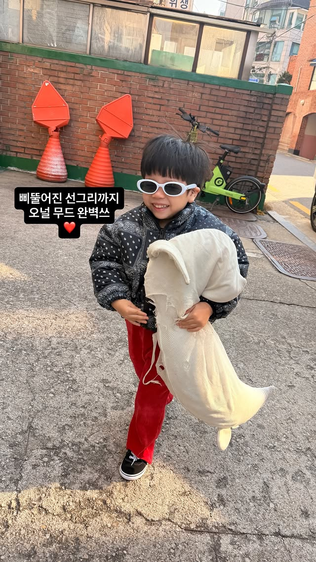 사진 속 준범 군은 네이비 컬러 패딩에 새빨간 바지를 입고 해맑게 웃고 있는 모습. 화이트 테두리가 인상적인 선글라스로 포인트를 주면서 자칫 난해할 수도 있었던 패션을 완벽하게 소화했다.
