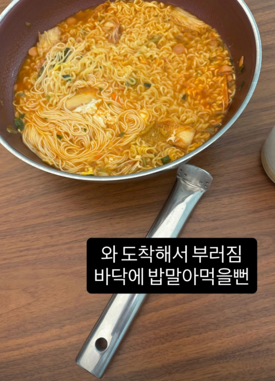 먹음직스러운 라면이 담긴 냄비는 손잡이가 떨어져 나간 상태. 곽튜브가 냄비를 들고 식탁으로 이동한 직후 손잡이가 떨어진 것으로 보인다.