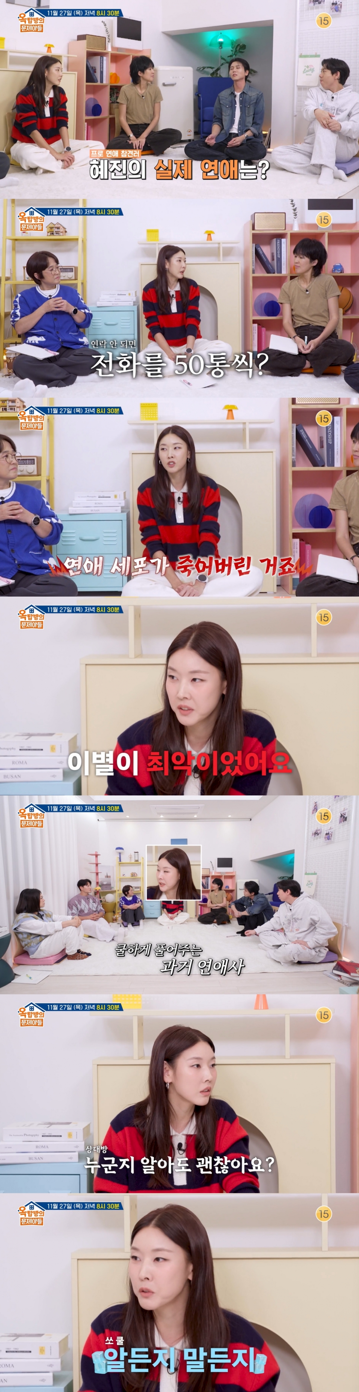 다양한 예능을 통해 솔직한 입담을 선보였던 한혜진은 이날 역시 자신의 연애 스토리를 가감 없이 대방출했다. 한혜진은 "혜진 누나가 연애하는 스타일도 연락 안 되면 전화를 50통씩 한다"라는 주우재의 말에 "완전히 연애 세포가 죽어 버린 거다. 이별이 최악이었다. 술을 먹다가 한 사람이 울기 시작했다"라며 과거 연애사를 털어놨다.