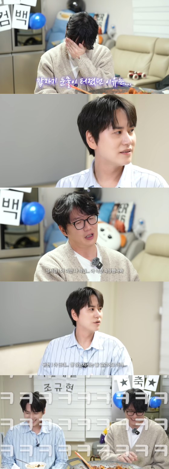 성시경은 또 "네 음악이 너무 아름답다"고 규현의 신곡을 칭찬했고, 규현은 "울 때 장난치는 줄 알았다"고 당혹감을 드러냈다.
