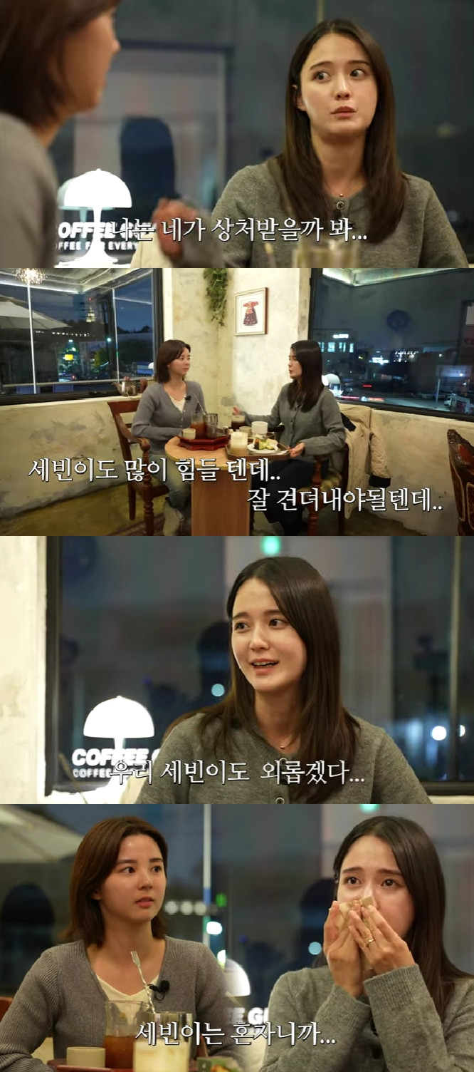 이어 "어느 날 카메라 앞에 앉아있는데 너무 외롭더라. 오래 일해도 외로운 직업이라는 걸 깨달았다. 어느 날 너랑 동갑인 여자애랑 촬영하는데 너 같았다. '오래 일한 나도 외로운데 저 친구는 얼마나 외로울까? 우리 세빈이도 외롭겠다'라는 생각을 많이 했다. 나는 주위에 사람들이 있어서 견딜 수 있었는데 너는 혼자니까 더 맘이 쓰였던 것 같다"면서 눈물을 보였다.