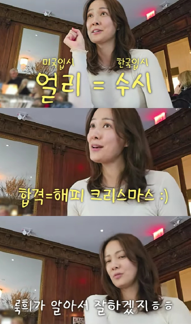 이어 "얼리가 우리나라로 따지면 수시다. 얼리가 크리마스 전에 발표다. 불합격해도 새드 크리스마스는 아니다. 단지 빨리 기쁨을 누리느냐 내년으로 넘어가느냐다. 룩희가 알아서 잘할 거다"라며 "미국 대학교는 공부를 잘한다고 잘 가거나 그렇지 않더라. 미국 입시는 알 수가 없다. (정보 얻기 어려워서) 미국이 더 어려운 것 같다"고 전했다.