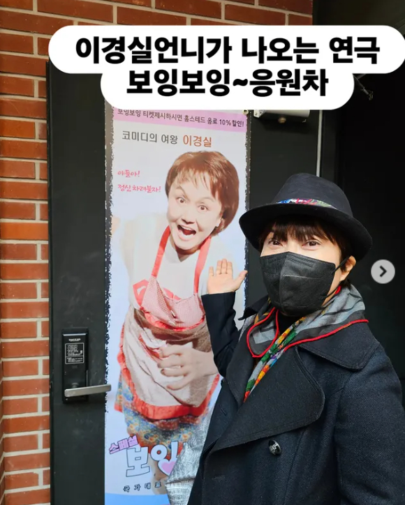 공개된 사진 속에는 이경실이 출연하는 연극 '보잉보잉'을 관람한 조혜련의 모습이 담겼다. 그는 "가은이는 진짜 스튜디어스인 줄. 한 번 보러가이소"라며 응원했다.