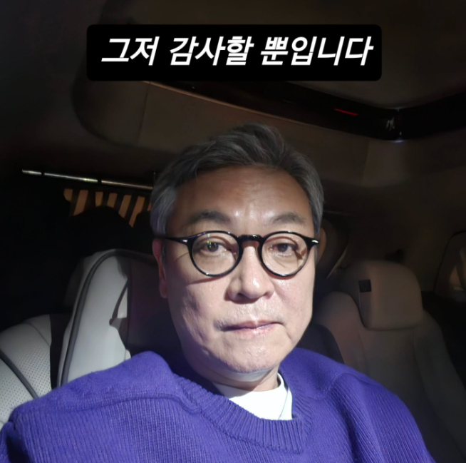 공개된 사진 속에는 차 안에 앉아있는 김의성의 모습이 담겨있고, 그는 '그저 감사할 뿐입니다'라고 전했다.