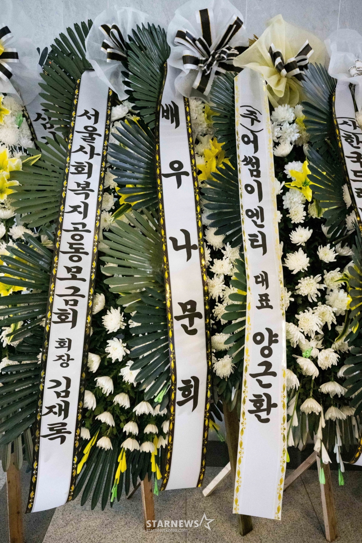 빈소 앞에는 고인의 동료들, 방송 관계자 보낸 조화가 빼곡히 놓였다. 배우 최불암, 나문희, 김종결, 김용건, 하정우, 이일화, 원기준, 신민아, 김우빈, 송옥숙, 윤미라, 장나라, 서예지, 송승헌, 가수 진성, 배우 겸 코미디언 임하룡 등이 자신의 이름이 적힌 조화를 보내 애도의 뜻을 전했다.