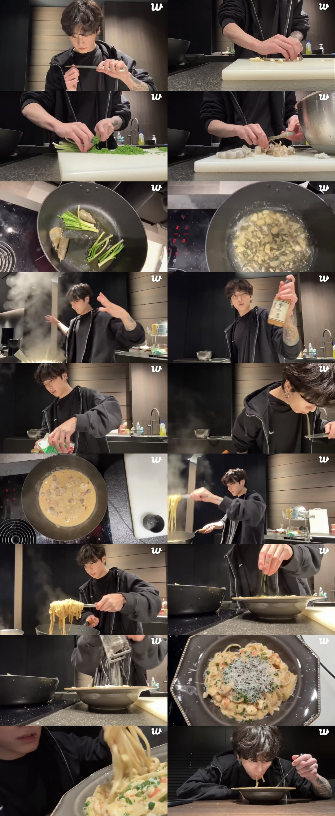 정국은 올리브유와 쪽파, 새우 머리로 낸 파기름에 마늘을 넣고 볶다가 페페론치노와 후추를 첨가했다. 그러면서 물 조금과 인스타그램에서 보고 산 성게알 간장 소스 1큰술, 생크림 2큰술, 버터를 넣고 끓였다. 이후 설탕 1/2큰술과 미리 썰어둔 새우살을 넣어 볶으며 "색깔이 너무 이쁘죠?" 라고 파스타 소스에 대한 만족감을 드러냈다.