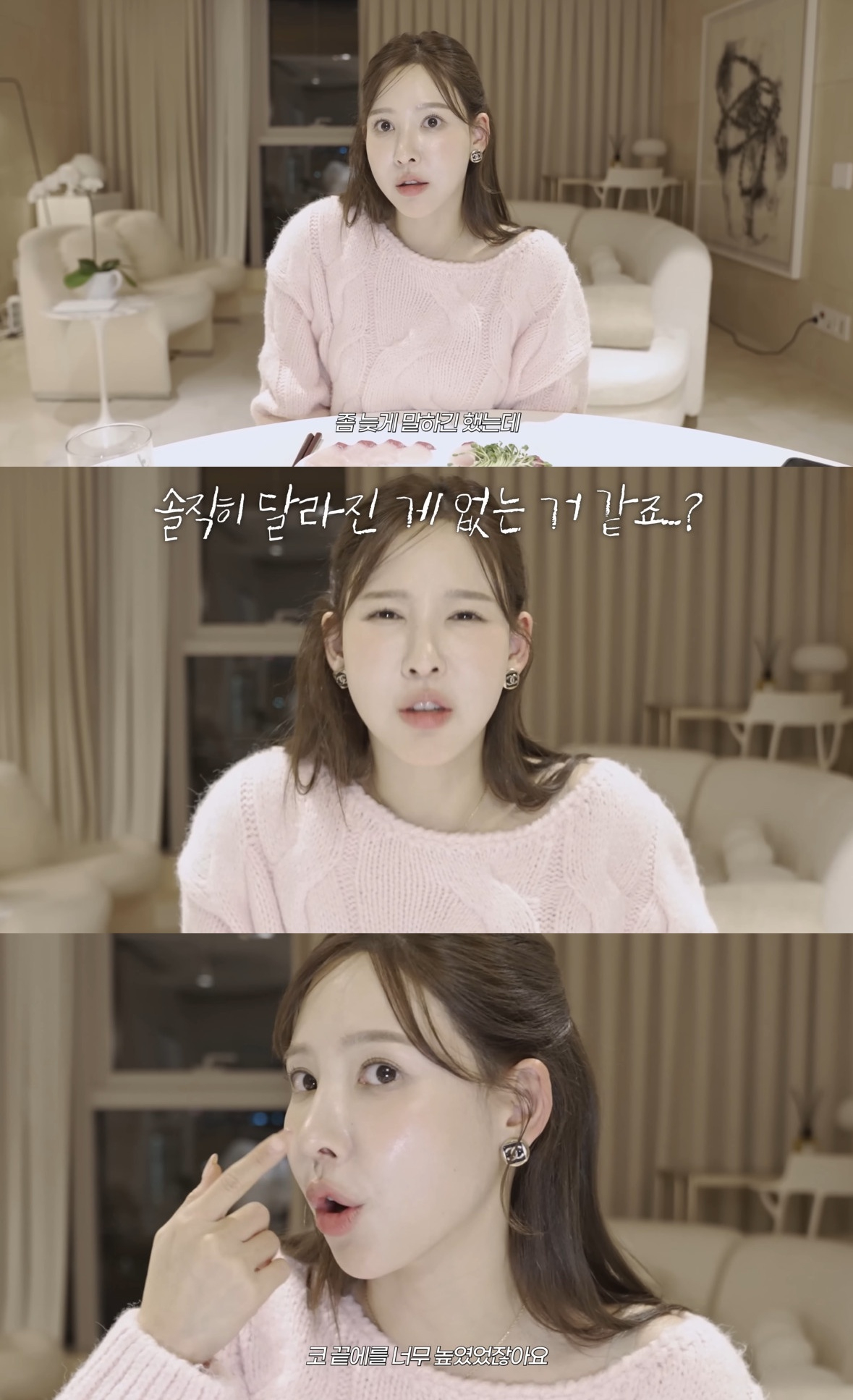 이어 "신기한 게 코끝만 살짝 조절했는데도 동글동글해지고 자연스러워진 거 같다. 옛날 코랑 80% 비슷해졌다"라며 "코가 높아서 얼굴 근육이 불편했었나 보다. 웃을 때 당기는 느낌이었다"라고 전했다.