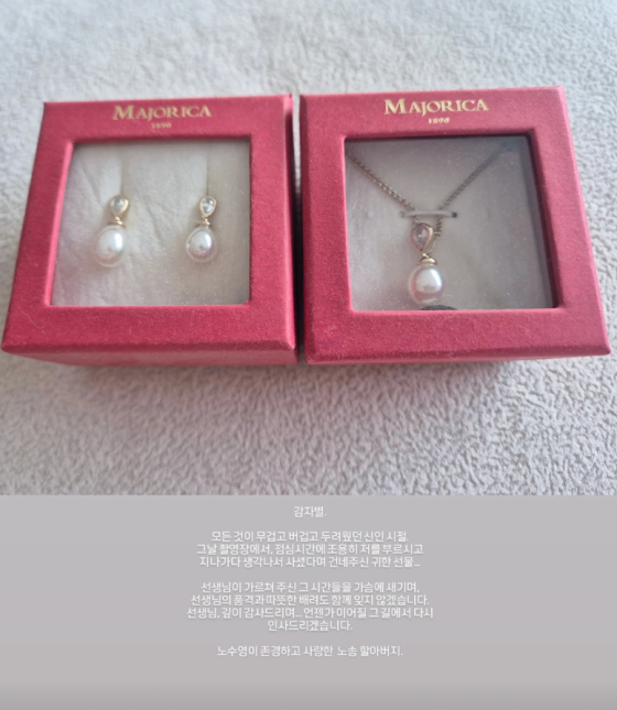 서예지는 27일 SNS에 데뷔 초 자신이 이순재로부터 선물받은 목걸이와 귀걸이 사진을 게재했다.