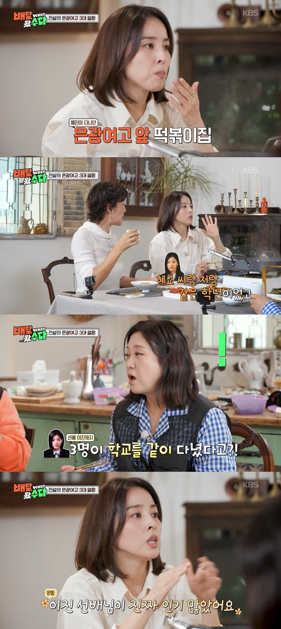 이날 짜장떡볶이를 주문한 한혜진은 "제가 은광여고를 나왔는데 그 앞 가게에서 팔았다"고 말했다. 이에 김숙은 "은광여고 3대 얼짱으로 유명하지 않냐"라고 이야기를 꺼냈고 이와 함께 당시 얼짱으로 이름을 날렸던 송혜교, 이진 한혜진의 사진이 나왔다.