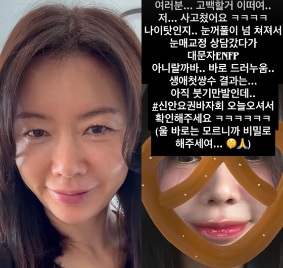 이내 그는 "나이 탓인지 눈꺼풀이 너무 쳐져서 눈매교정 상담 갔다가 대문자 ENFP 아니랄까 봐 바로 드러누웠다. 생애 첫 쌍수(쌍꺼풀 성형수술) 결과는.. 아직 붓기만발이다. 바자회 오셔서 확인해 달라"라고 털어놨다.