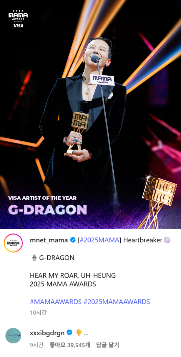 이 가운데, 지드래곤은 '마마 어워즈'가 SNS에 올린 자신의 무대 영상 댓글에 엄지를 아래로 내린 이모티콘 하나를 올리며 눈길을 끌었다. 사실상 스스로 무대를 '셀프 혹평'한 것이라는 반응이 나오고 있다.