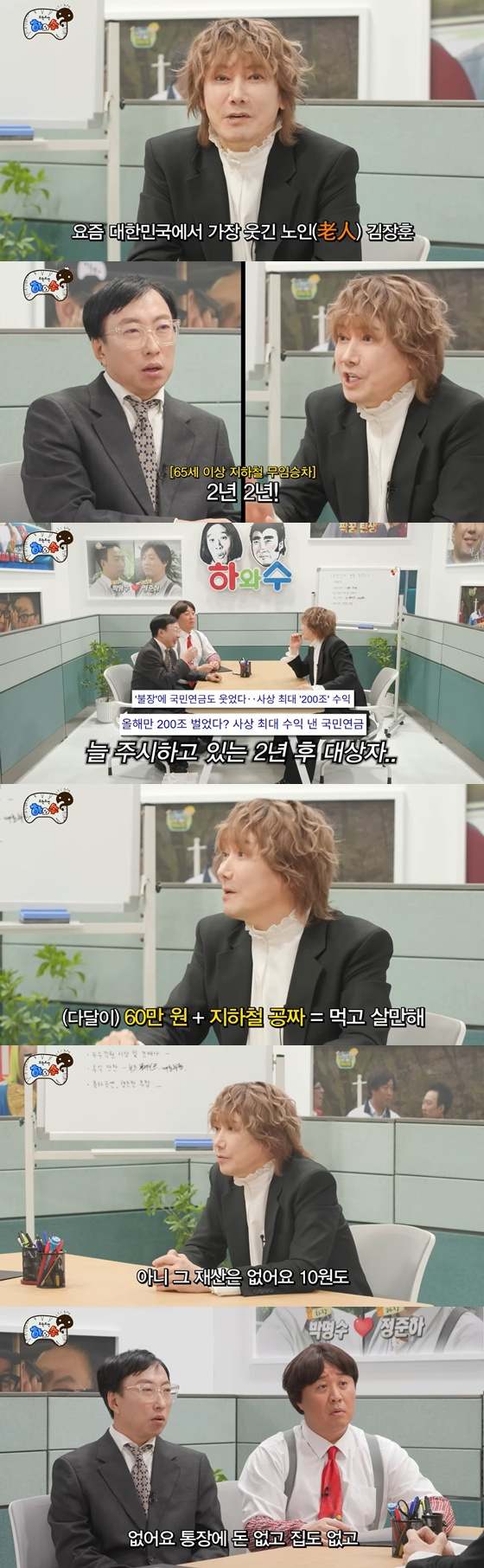 김장훈은 "노인 아니다"라는 MC 박명수의 말에 "노인 맞지 뭐. 2년 뒤에 지하철 공짜로 탄다. 그것만 기다리고 있다. 이거랑, 국민연금. 이번에 200조 늘어났대. 나도 많이 부었다. (매달) 한 60만 원 나오나 봐. 60만 원 나오고 지하철 공짜면, 먹고살만하다"라고 거침없이 얘기했다.