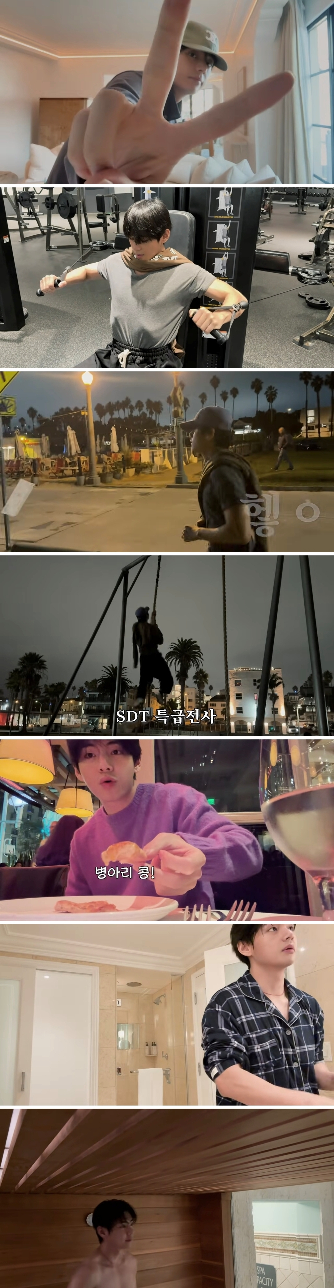 호텔에 도착한 뷔는 간단한 식사를 끝내자마자 바로 헬스장으로 달려가 운동을 시작했다. 헬스장에서 나와 다시 해변가에서 러닝을 하며 철저히 관리하는 모습으로 자기관리 끝판왕의 면모를 뽐냈다.
