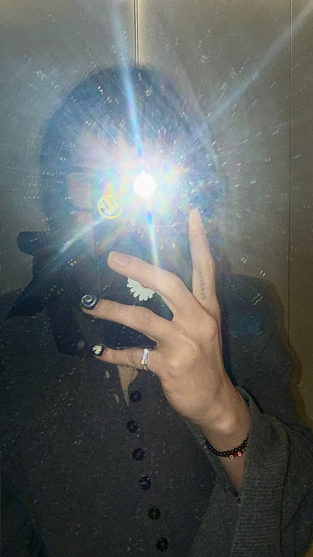 사진 속 지드래곤은 다소 짧아진 앞머리와 화려한 네일아트, 뿔테 안경을 쓰고 거울을 바라보고 있는 모습. 반짝이는 플래시로 특유의 힙한 매력을 더했다.