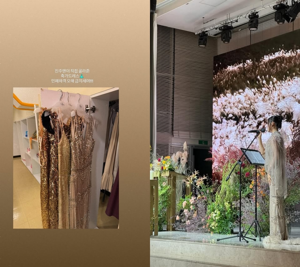 공개된 사진 속에는 여러 벌의 화려한 드레스가 담겨있고, 민경아는 "진주맨이 직접 골라준 축가 드레스"라고 해명했다.
