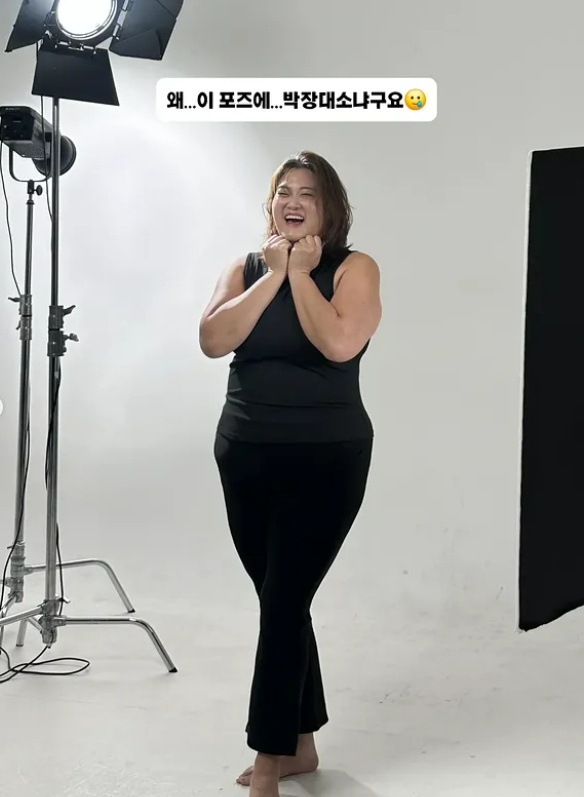 사진 속 박수지는 다이어트를 일부 성공한 기념으로 화보 촬영을 하는 모습이었다. 그는 148kg에서 현재 83kg까지 총 65kg을 감량했다고 밝혔다.