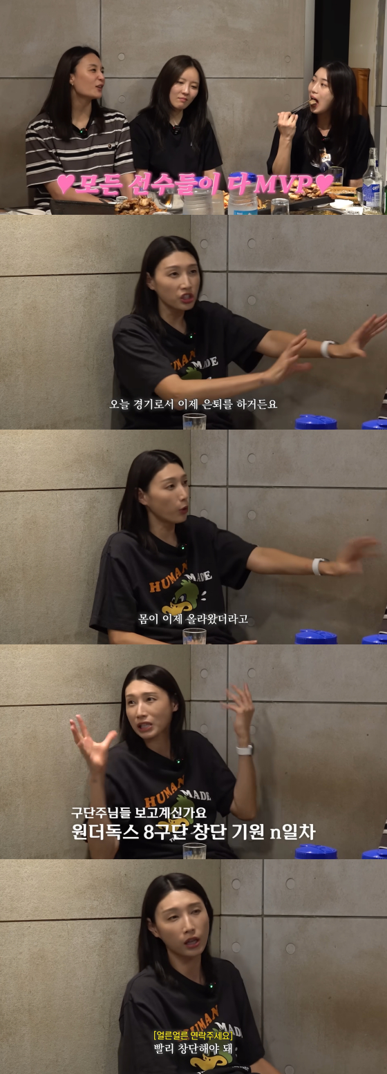 김연경은 "표승주 몸이 이제 올라왔다. 어디를 가야 한다. 아니면 원더독스가 8구단 창단을 해야 한다"고 호소했다.
