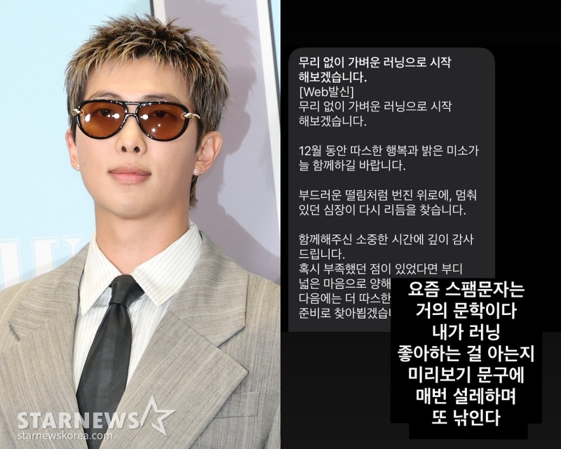 RM은 2일 개인 SNS에 "요즘 스팸 문자는 거의 문학이다. 내가 러닝 좋아하는 걸 아는지 미리보기 문구에 매번 설레하며 또 낚인다"라며 자신의 휴대폰에 온 스팸 문자를 캡처 게재했다.