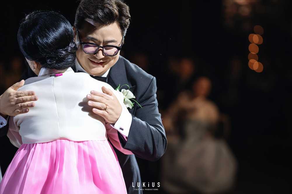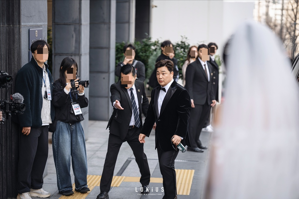 한복 차림의 장모와 가볍게 포옹하며 미소 짓는 윤정수의 모습도 포착됐다. 예식장 앞에서 경호원의 안내를 받으며 이동하는 윤정수의 모습 또한 시선을 끈다. TV조선 예능 프로그램 '조선의 사랑꾼' 제작진은 카메라로 윤정수의 결혼식 순간을 기록하고 있다. 든든한 새신랑을 바라보는 원진서의 뒷모습 역시 사진 속에 자연스럽게 녹아 있다.