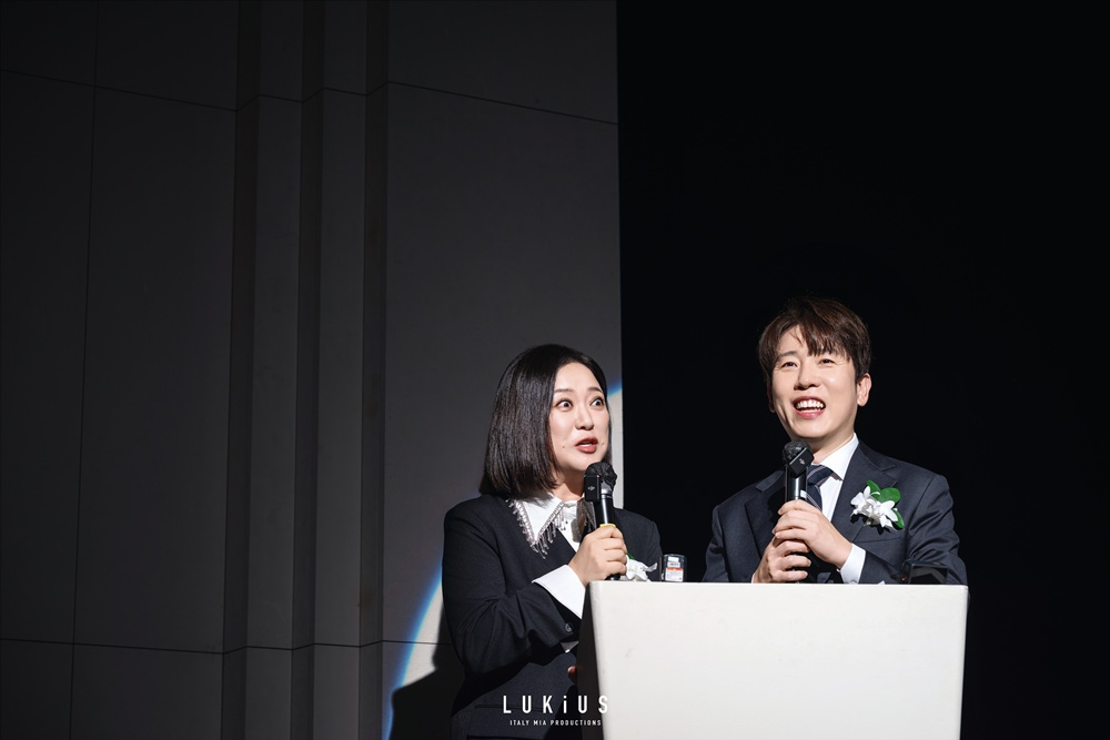 결혼식 사회를 맡았던 코미디언 김숙과 남창희의 투샷도 공개됐다. 두 사람은 나란히 마이크를 들고 유쾌한 결혼식을 이끌었다. 절친한 선배를 마침내 장가보내며 한껏 들뜬 표정이다. 김숙은 과거 JTBC 예능 프로그램 '님과 함께 시즌2 - 최고의 사랑'에서 가상 부부로 호흡을 맞춘 인연을 언급하며 "내가 (사회를) 해도 되는지 모르겠다"며 "윤정수 씨의 간곡한 부탁으로 하게 됐다"고 너스레를 떨어 웃음을 자아냈다.