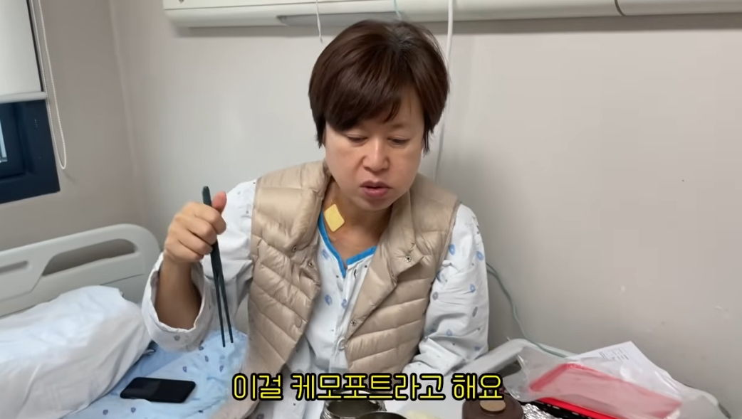 이후 1차 항암을 위해 입원한 박미선은 목 주변에 삽입한 케모포트를 공개했다. 케모포트는 정맥을 통해 심장 가까이의 굵은 혈관까지 삽입되는 관의 일종. 박미선은 "항암 주사를 녹으면 혈관이 녹아서 정맥주사 대신 효율적으로 치료할 수 있는 방법"이라고 말했다.