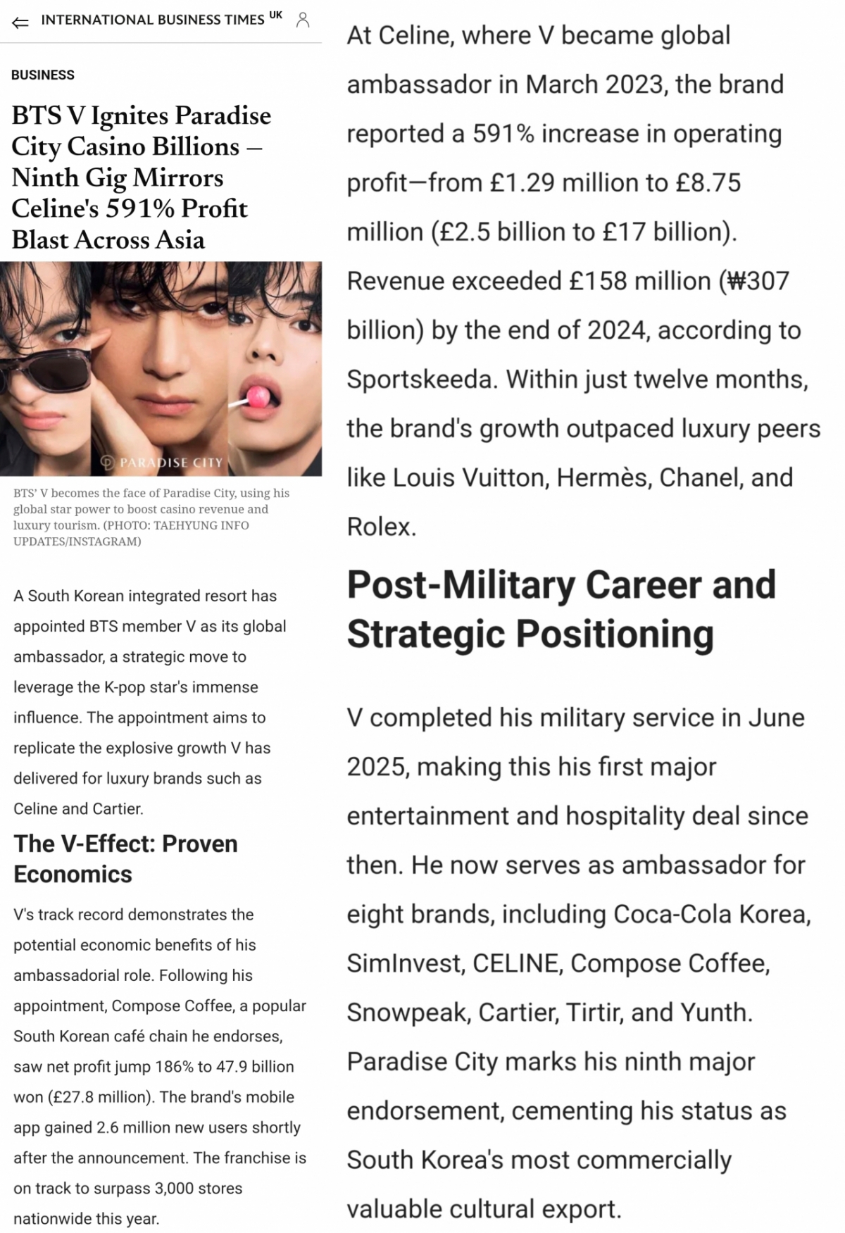 IBT는 '뷔의 전역 후 경력 및 전략적 포지셔닝'의 소제목에서 "뷔가 전역 후 첫 번째 엔터테인먼트 및 호스피탈리티(호텔, 음식서비스, 카지노, 관광 등 서비스산업 전반) 계약을 체결했다"고 설명했다.