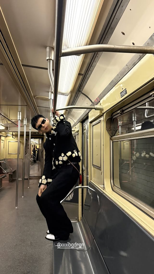 사진 속 지드래곤은 미국 뉴욕에 위치한 한 지하철 내부에서 장난기 가득한 분위기를 자아내고 있는 모습. 그는 머리 끝부터 발 끝까지 명품 브랜드 샤넬로 풀착장을 한 채 손잡이를 잡은 후 신발을 신고 의자 위에 올라가있다.
