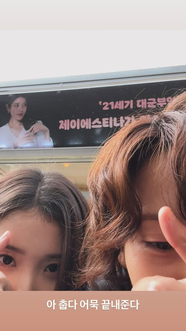 공개된 사진 속에는 한 주얼리 브랜드가 드라마 '21세기 대군부인' 촬영장에 보낸 분식차 앞에서 인증샷을 찍고 있는 이연과 아이유의 모습이 담겼다.