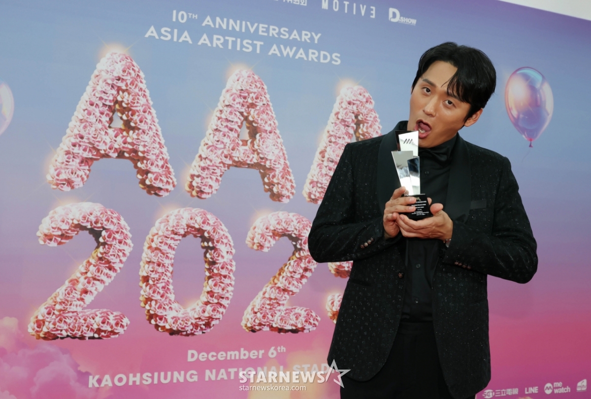 배우 이준혁이 6일 가오슝 내셔널 스타디움에서 진행된 스타뉴스 주최 '10주년 아시아 아티스트 어워즈 2025(10th Anniversary Asia Artist Awards 2025, '10주년 AAA 2025')에서 10 레젠더리 남자배우상을 수상한 뒤 포즈를 취하고 있다. 12월 6일~7일 양일에 걸쳐 가오슝 내셔널 스타디움에서 펼쳐지는 '10주년 아시아 아티스트 어워즈 2025(10th Anniversary Asia Artist Awards 2025, '10주년 AAA 2025')'와 페스타 'ACON 2025'는 MTN(머니투데이방송)과 위버스(Weverse)를 통해 각각 TV와 온라인 스트리밍으로 생중계 된다. /2025.12.06 /사진=이동훈 photoguy@