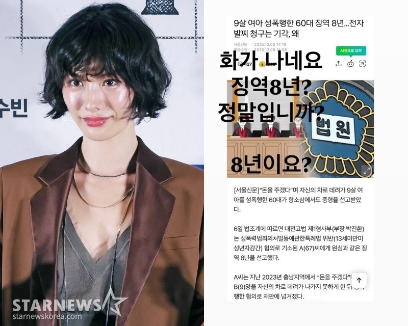 나나가 공유한 기사는 9세 여아를 성폭행한 60대에게 징역 8년이 선고된 사건이다. 법조계에 따르면, 대전고법 제1형사부는 성폭력범죄의처벌등에관한특례법 위반 혐의로 기소된 67세 A씨에게 항소심에서도 원심과 같은 징역 8년을 선고했다. A씨는 지난 2023년 충남 지역에서 '돈을 주겠다'며 9세 B양을 자신의 차로 데려가 나가지 못하게 한 뒤 성폭행한 혐의로 재판에 넘겨졌다.