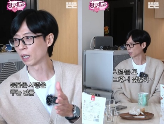 그러다 유재석은 인간관계에 대한 발언을 했다. 그는 "동물은 사랑을 주는 만큼 보답하는데 사람은 또 그렇지 않다. 그래서 '짐승만도 못하다'는 말이 있는 것"이라고 말했다.