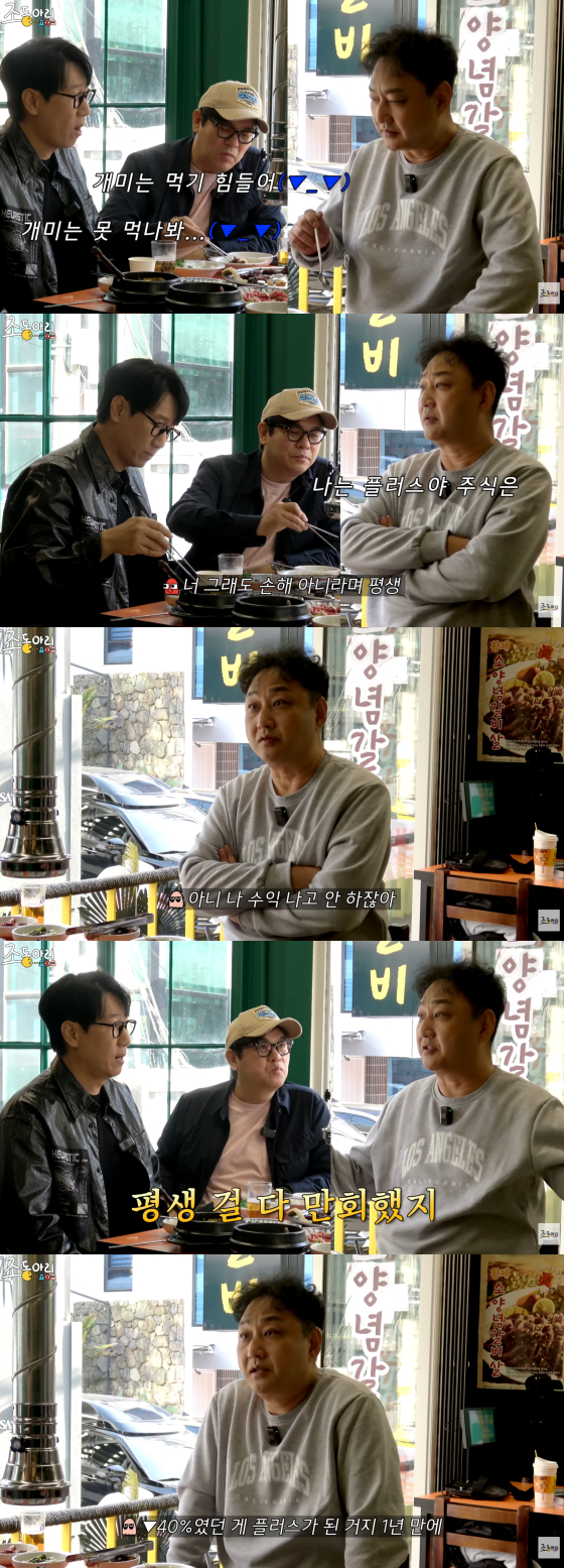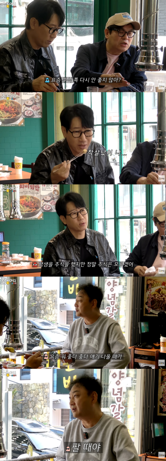 김용만이 "객관적으로 봐도 주식은 돈을 먹을 수 있는 구조가 아니"라고 토로하자 지석진은 "개미는 못 먹는다"고 맞장구를 쳤다.