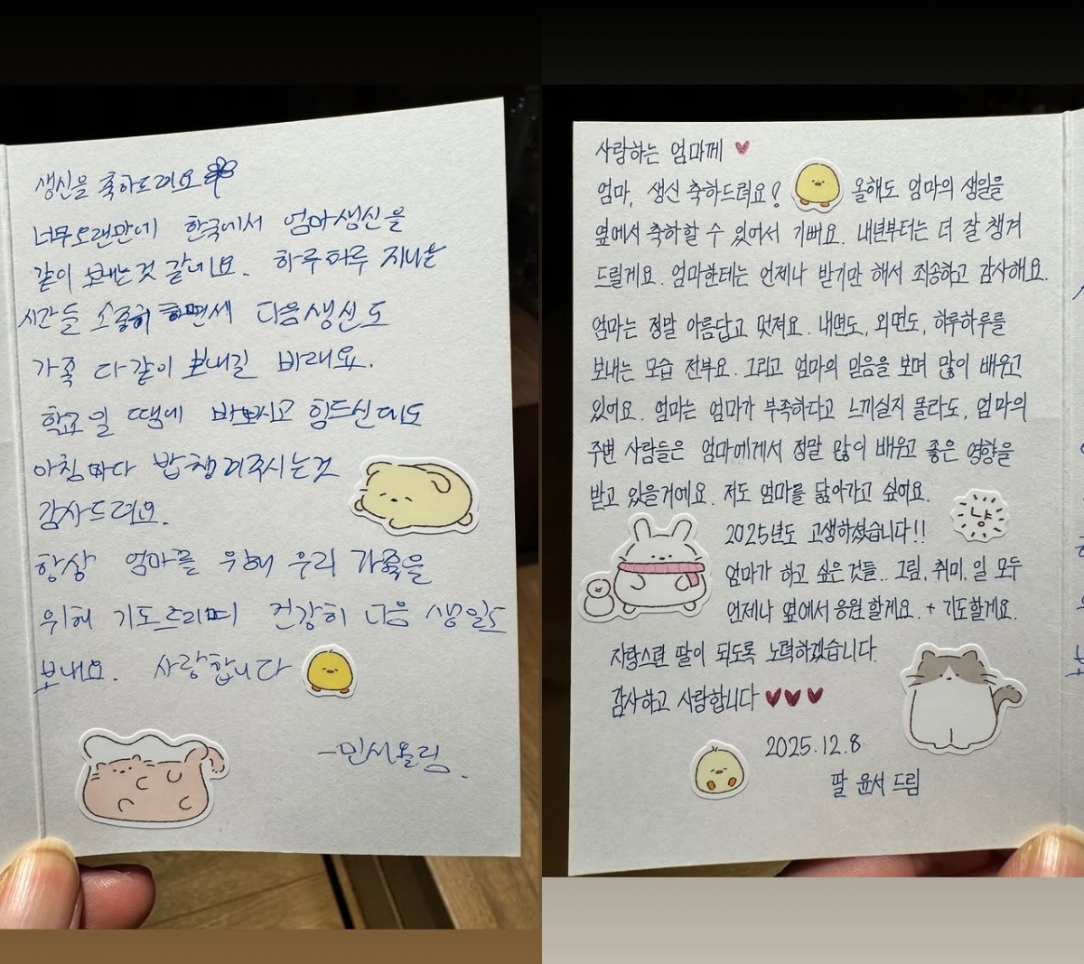 첫째 딸은 '너무 오랜만에 한국에서 엄마 생신을 같이 보내는 것 같다. 하루하루 지나는 시간을 소중히 하면서 다음 생신도 가족 다 같이 보내길 바란다'고 적었고, 둘째 딸은 '엄마한테는 언제나 받기만 해서 죄송하고 감사하다. 엄마는 정말 아름답고 멋지다. 내면도, 외면도, 하루하루를 보내는 모습 전부"라며 "엄마는 엄마가 부족하다고 느끼실지 몰라도, 엄마의 주변 사람들은 엄마에게서 정말 많이 배우고 좋은 영향을 받고 있을 거다. 저도 엄마를 닮아가고 싶다'고 했다.