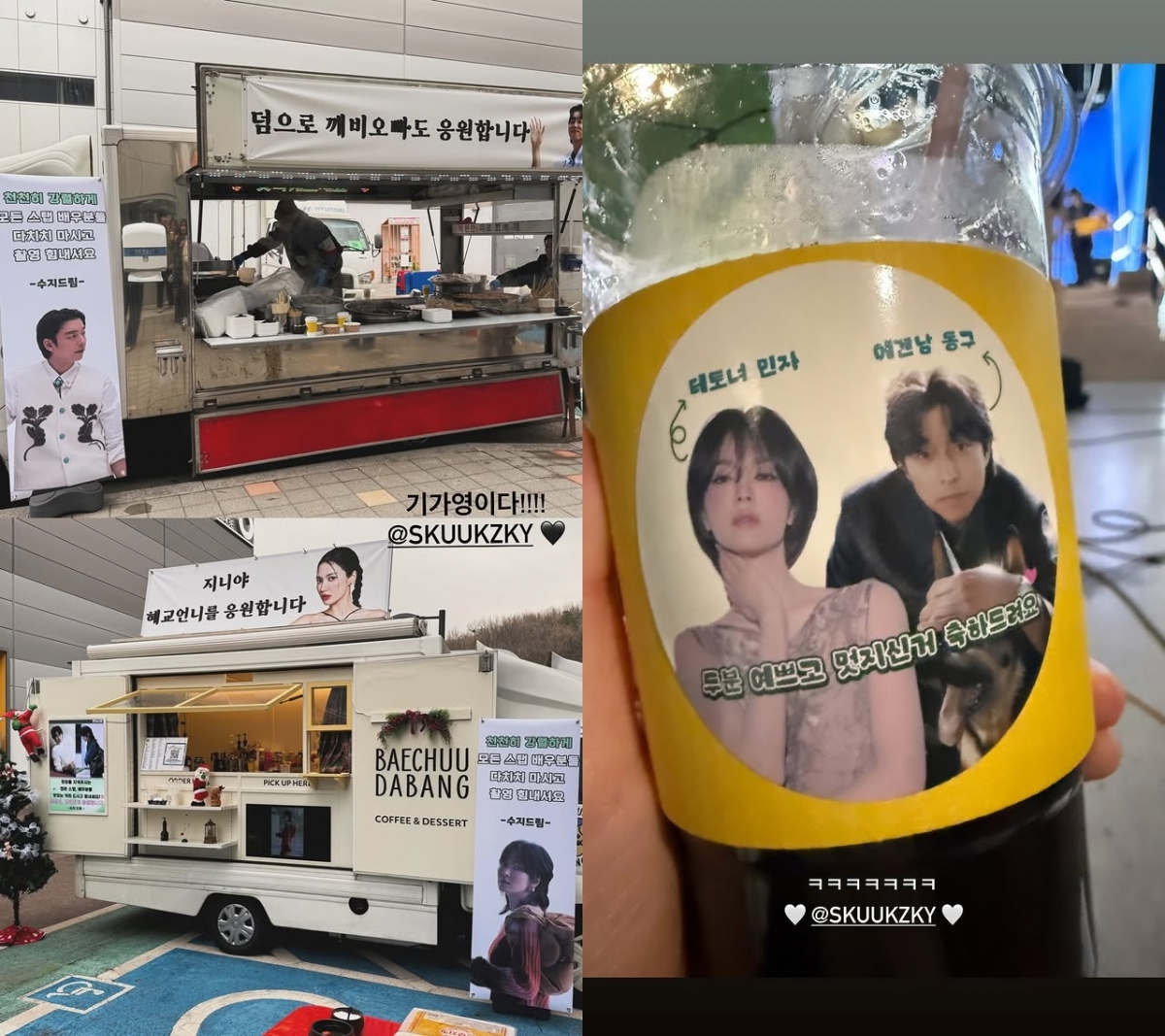 공개된 사진 속에는 수지가 드라마 '천천히 강렬하게'(가제) 촬영장에 보낸 커피차가 담겨있다. 해당 커피차에는 '지니야 혜교 언니를 응원합니다'라는 문구가 적혀있었고, 옆의 분식차에는 '덤으로 깨비오빠도 응원합니다'라고 공유를 응원하는 문구 또한 적혀있어 눈길을 끈다.