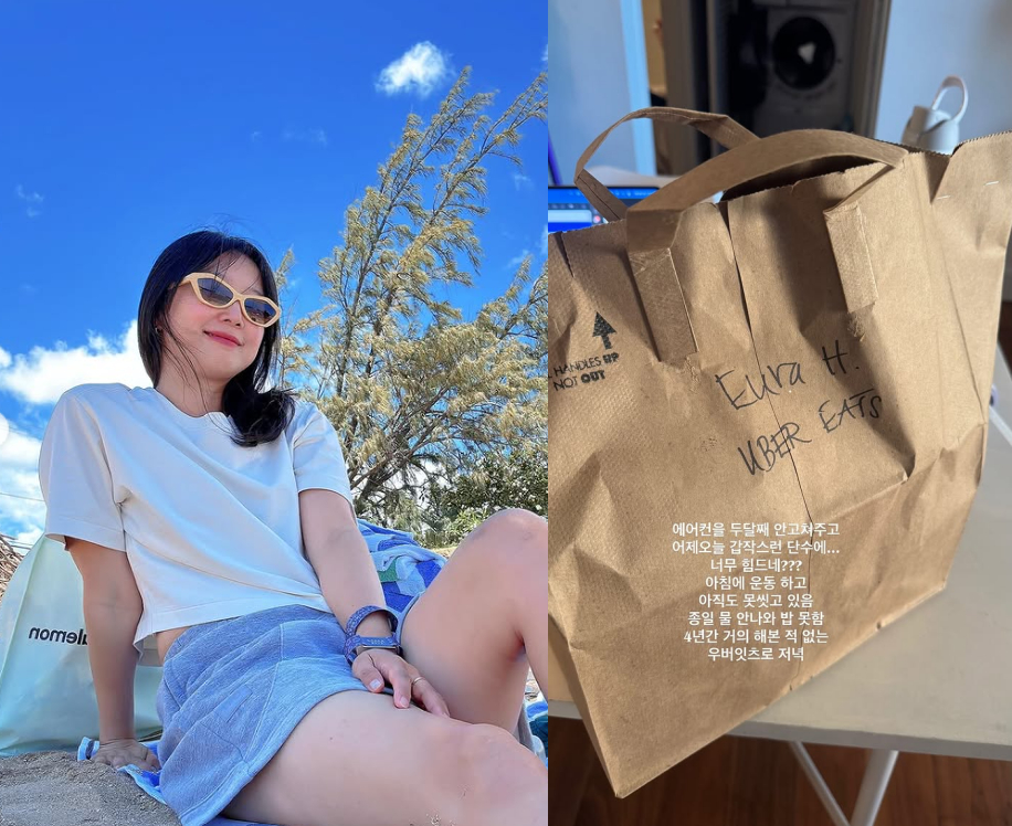 공개된 사진 속에는 배달 음식을 시켜 먹은 듯한 모습이 담겼다. 그는 "아침에 운동하고 아직도 못 씻고 있다. 종일 물 안 나와 밥도 못 했다"며 "4년간 거의 해본 적 없는 우버이츠로 저녁"이라고 밝혔다.
