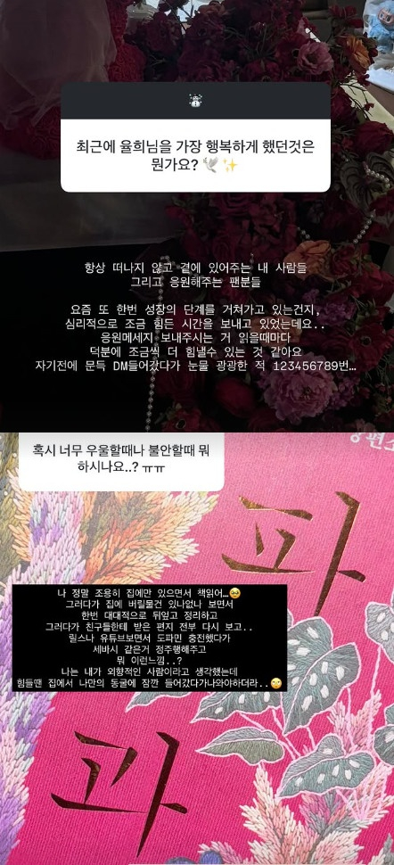 율희는 "항상 떠나지 않고 곁에 있어주는 내 사람들 그리고 응원해 주는 팬분들"이라고 답하면서도 "요즘 또 한 번 성장의 단계를 거쳐 가고 있는 건지, 심리적으로 조금 힘든 시간을 보내고 있었다"라고 솔직하게 터놓았다.