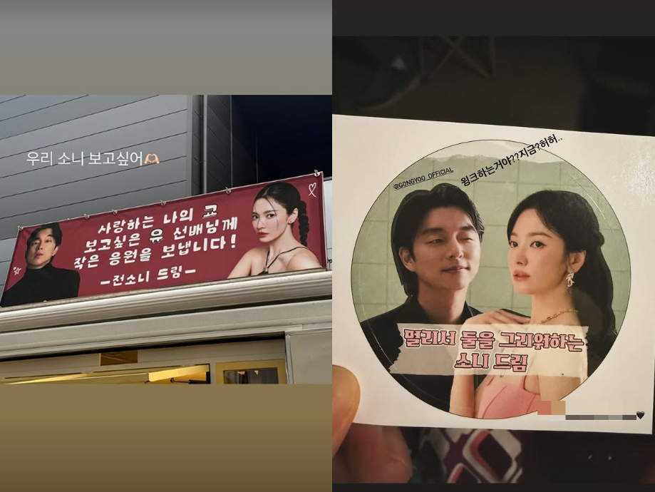공개된 사진 속엔 전소니가 송혜교의 촬영 현장에 보낸 커피차다. 특히 현수막에는 "사랑하는 나의 교, 보고싶은 유 선배님께 작은 응원 보냅니다. 멀리서 그리워하는 소니 드림"이란 문구가 담겨있다. 이때 송혜교는 윙크하는 공유의 사진에 "윙크하는 거야? 지금? 허허.."라며 황당해하는 모습을 보였다.