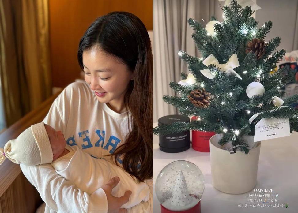 공개된 사진 속엔 이시영이 편지와 함께 크리스마스트리에 감격한 모습이다. 특히 조명이 반짝이는 크리스마스트리가 이목을 끈다.