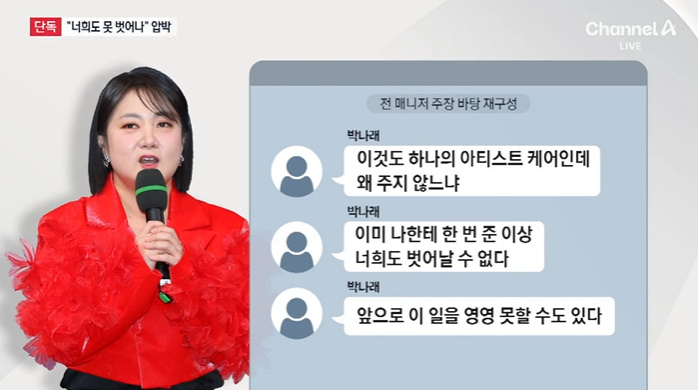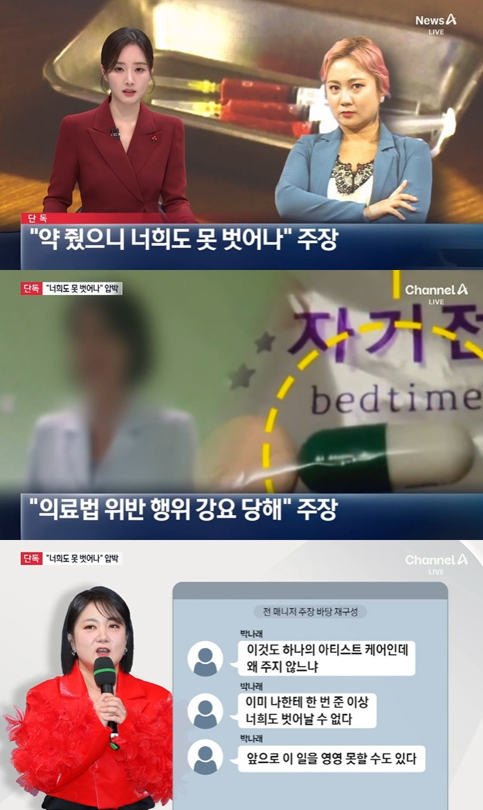 전 매니저는 박나래에게 그가 요구한 약을 주지 않자 "이것도 하나의 아티스트 케어인데 왜 주지 않느냐", "이미 나한테 한 번 준 이상 너희도 벗어날 수 없고 앞으로 이 일을 영영 못할 수도 있다"는 내용의 메시지를 보냈다고 주장했다.