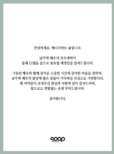 매니지먼트 숲은 12일 공식 SNS를 통해 "남주혁 배우의 전속계약이 올해 12월을 끝으로 종료될 예정임을 알려드린다"고 밝혔다.