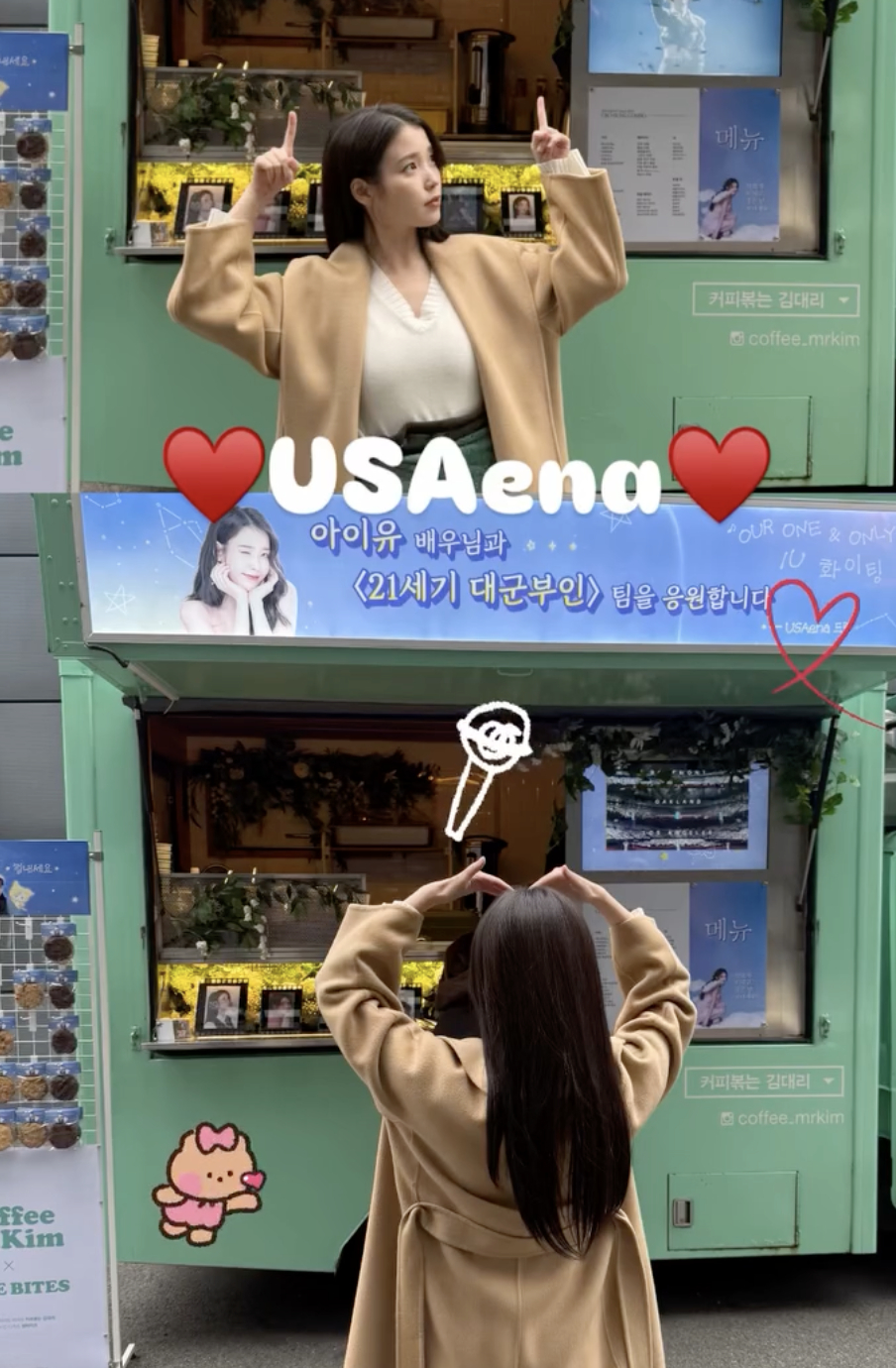 아이유는 13일 자신의 SNS를 통해 현재 촬영 중인 드라마 '21세기 대군부인' 촬영장에 도착한 커피차와 간식차 인증 사진을 여러 장 게재했다.