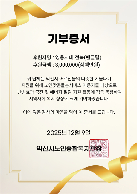 임영웅 팬클럽 영웅시대 전북방은 12월 9일 지역사회 취약계층을 위해 300만 원의 기부금을 익산시 노인종합복지관에 전달했다.
